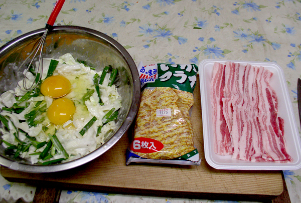 卵と太目に千切りしたキャベツとニラを入れ、スプーンでよくかき混ぜます。